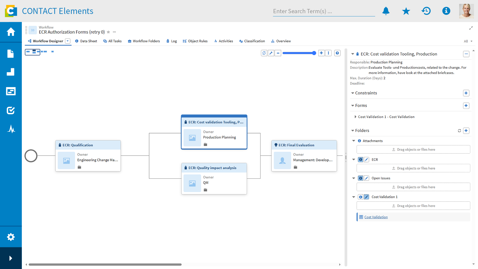Engineering Change-Prozesse bestehen in der Regel aus Änderungsanforderung (Engineering Change Request, ECR), Änderungsauftrag (Engineering Change Order, ECO) und Änderungsmitteilung (Engineering Change Notification, ECN). Die im Rahmen des Prozesses erfolgende Bewertung und Bearbeitung technischer Änderungen erfordert häufig das Zusammenwirken von mehreren Abteilungen und Fachdisziplinen. Speziell auf das Änderungsmanagement ausgerichtete Workflow-Vorlagen helfen Ihnen, diese hoch arbeitsteiligen Vorgänge effizient und sicher auszuführen.