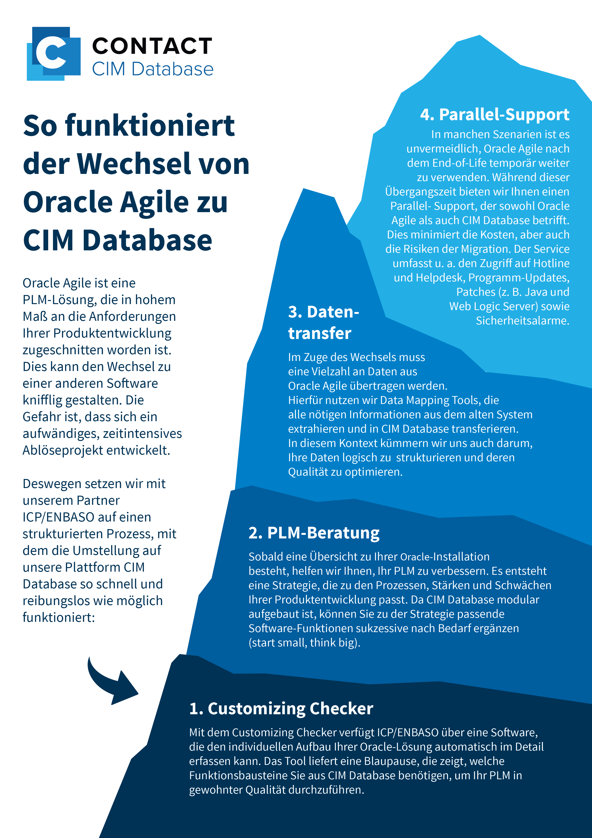 Oracle Agile ist tief in den Autoren-Systemen des Engineerings sowie den Prozessen des Produktlebenszyklus verwurzelt. Unsere Expert*innen kennen die Feinheiten im Umgang mit der Plattform und nutzen für den Wechsel Migrations-Tools, die einen reibungslosen Umstieg ermöglichen. Ihr Unternehmen erhält mit CIM Database eine modular aufgebaute Lösung, die Funktionen für Projektmanagement, produktzentrisches Datenmanagement, Prozessautomatisierung sowie Asset Management vereint.