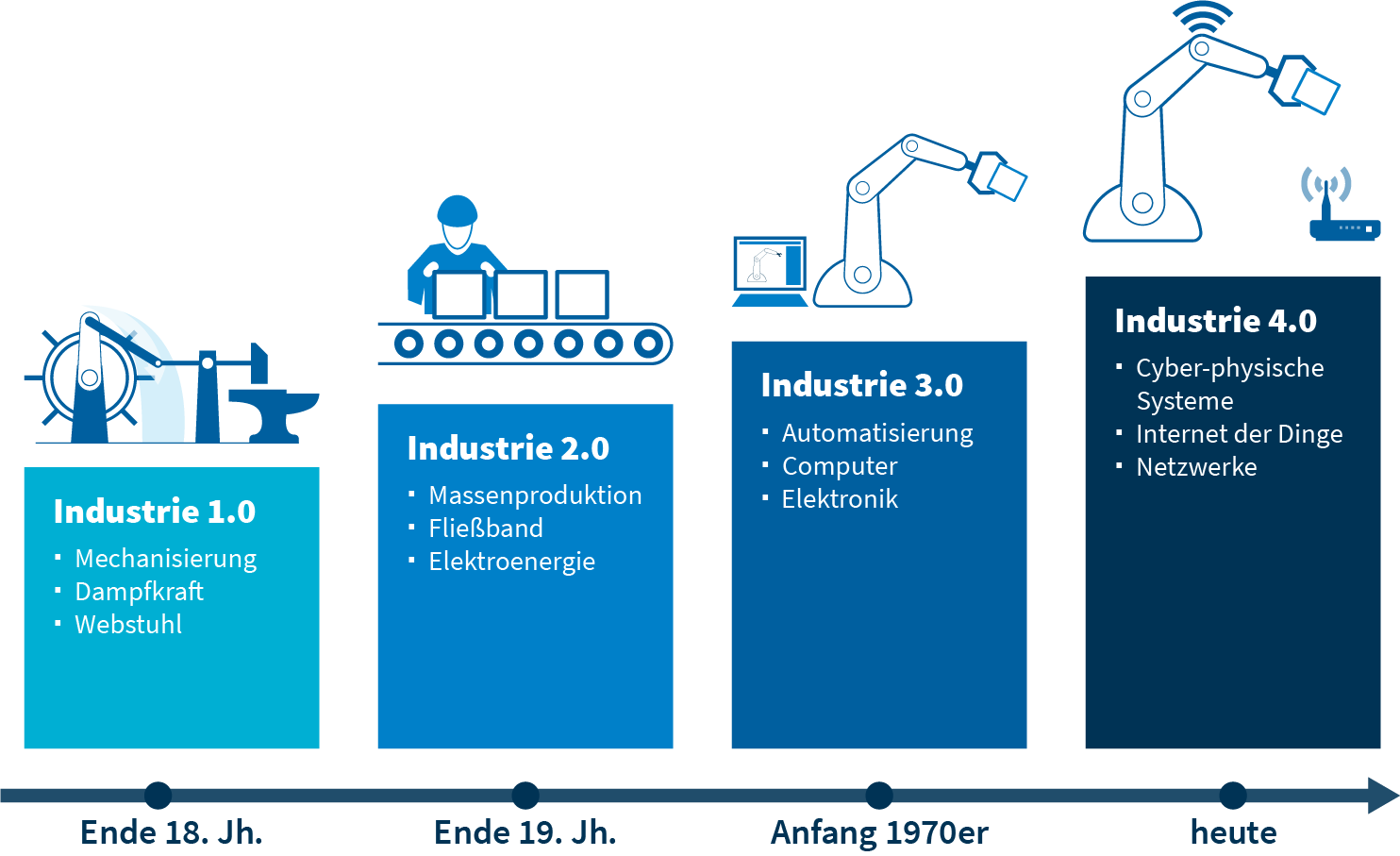 Auf die Mechanisierung und Elektrifizierung in der ersten und zweiten Stufe der industriellen Revolution folgte Anfang der 1970er Jahre in der dritten die Automatisierung. Die vierte Stufe ist geprägt durch eine umfassende digitale Transformation der Prozesse und Geschäftsmodelle. Die Industrie verspricht sich von Digitalisierung der Wertschöpfungsketten erhebliche Rationalisierungseffekte − die Umsetzung des Transformationsprozesses stellt die Unternehmen aber auch vor große Herausforderungen.
