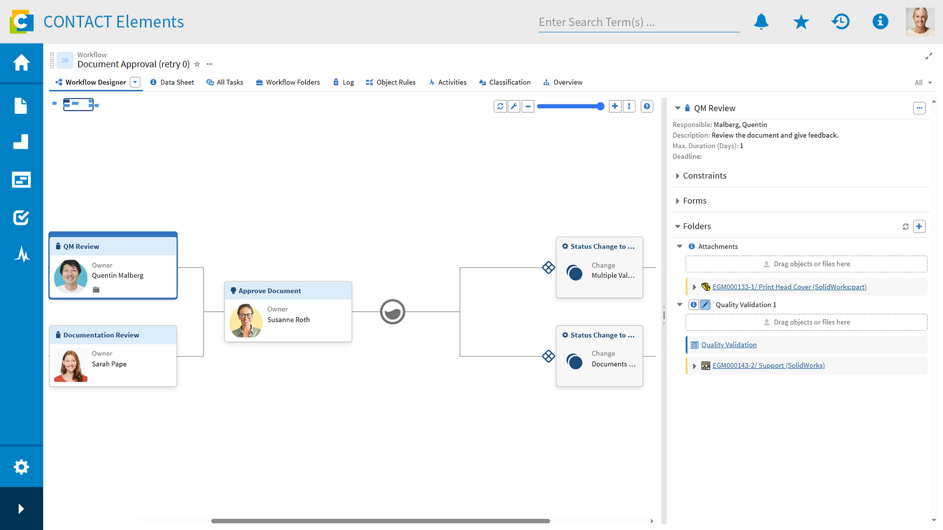 Efficient data and process management are central tasks of product lifecycle management. With CONTACT Elements Process Management, you can use status networks to define the sequence of states that information objects such as documents pass through - from processing to release to deactivation. This gives employees access to compliant information at all times. A powerful roles and rights system ensures that only authorized people are able to make changes.
