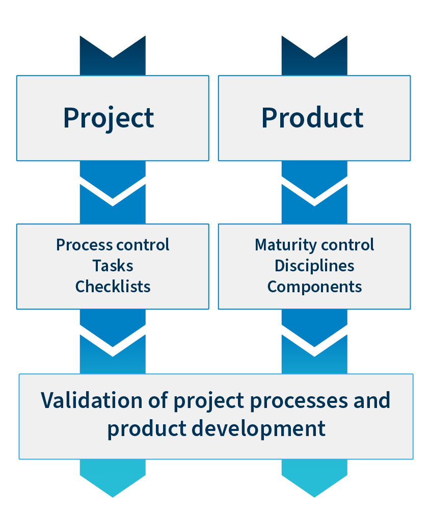 Corresponding to Quality Gates for project processes, the product maturity level serves as an important control and management instrument for the systematic administration and adaptation of product data. You can flexibly supplement predefined maturity phases, configured as standard in the system (such as Idea or Prototype), with phases like Concept, Design, or Validation. This allows you to accurately describe the exact development status of your product. Key Performance Indicators (KPIs) and other metrics provide a quick overview of the product maturity level. This enables you to intervene early if problems arise. The metrics can be freely defined and automatically calculated – for example, for the fulfillment of functional requirements or specified target criteria.