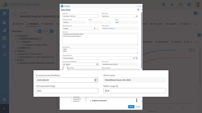 To effectively utilize environmental data, it must be centrally accessible and of high quality. CONTACT Elements provides the ideal foundation for this: The integration platform is based on open standards like HTML5, REST, and Python. It can seamlessly synchronize data from third-party systems via powerful interface technology – whether from your own IT landscape, suppliers, or external environmental databases. Integrated AI applications support you in structuring the data and evaluating its quality.